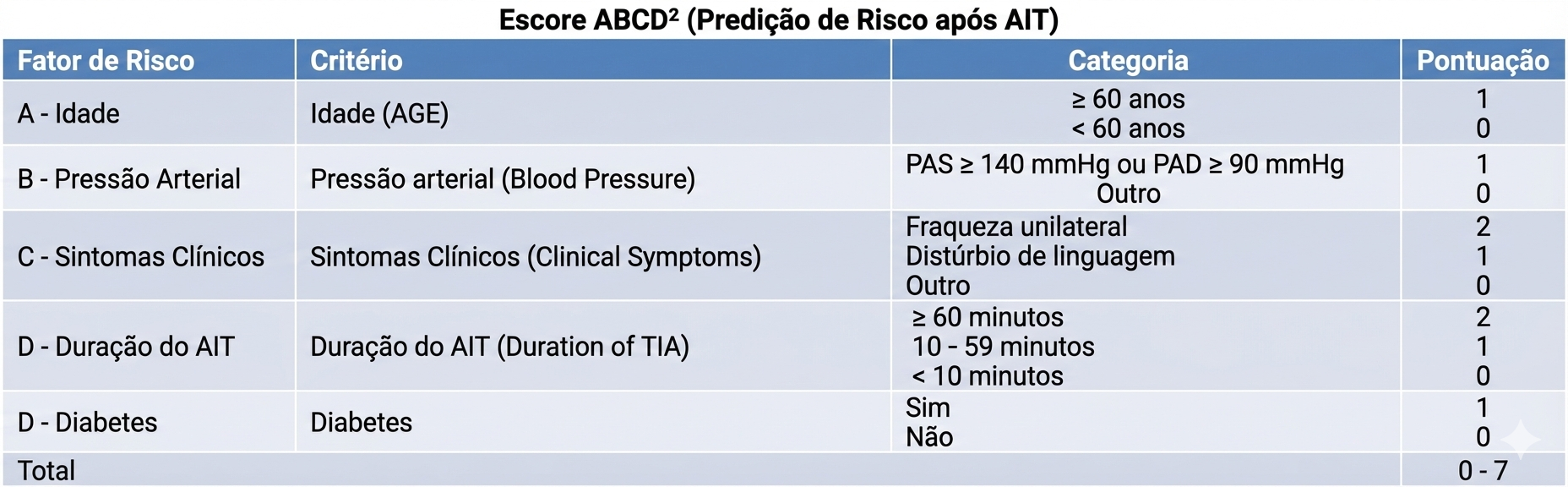 O escore ABCD² é uma ferramenta clínica desenvolvida para predizer o risco precoce de Acidente Vascular Cerebral (AVC) isquêmico, especificamente durante a primeira semana (7 dias) após um episódio de Ataque Isquêmico Transitório (AIT). Ele utiliza variáveis clínicas identificadas como preditores independentes de risco cerebrovascular.