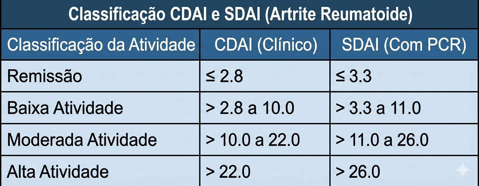 O CDAI (Clinical Disease Activity Index) é um instrumento composto utilizado para a avaliação objetiva e seriada da Artrite Reumatoide (AR) e não utiliza reagentes de fase aguda (exames de sangue) em seu cálculo, baseando-se puramente em parâmetros clínicos. o SDAI (Simplified Disease Activity Index), por sua vez, segue a mesma lógica de avaliação da AR, porém adiciona a Proteína C-Reativa (PCR) à soma.