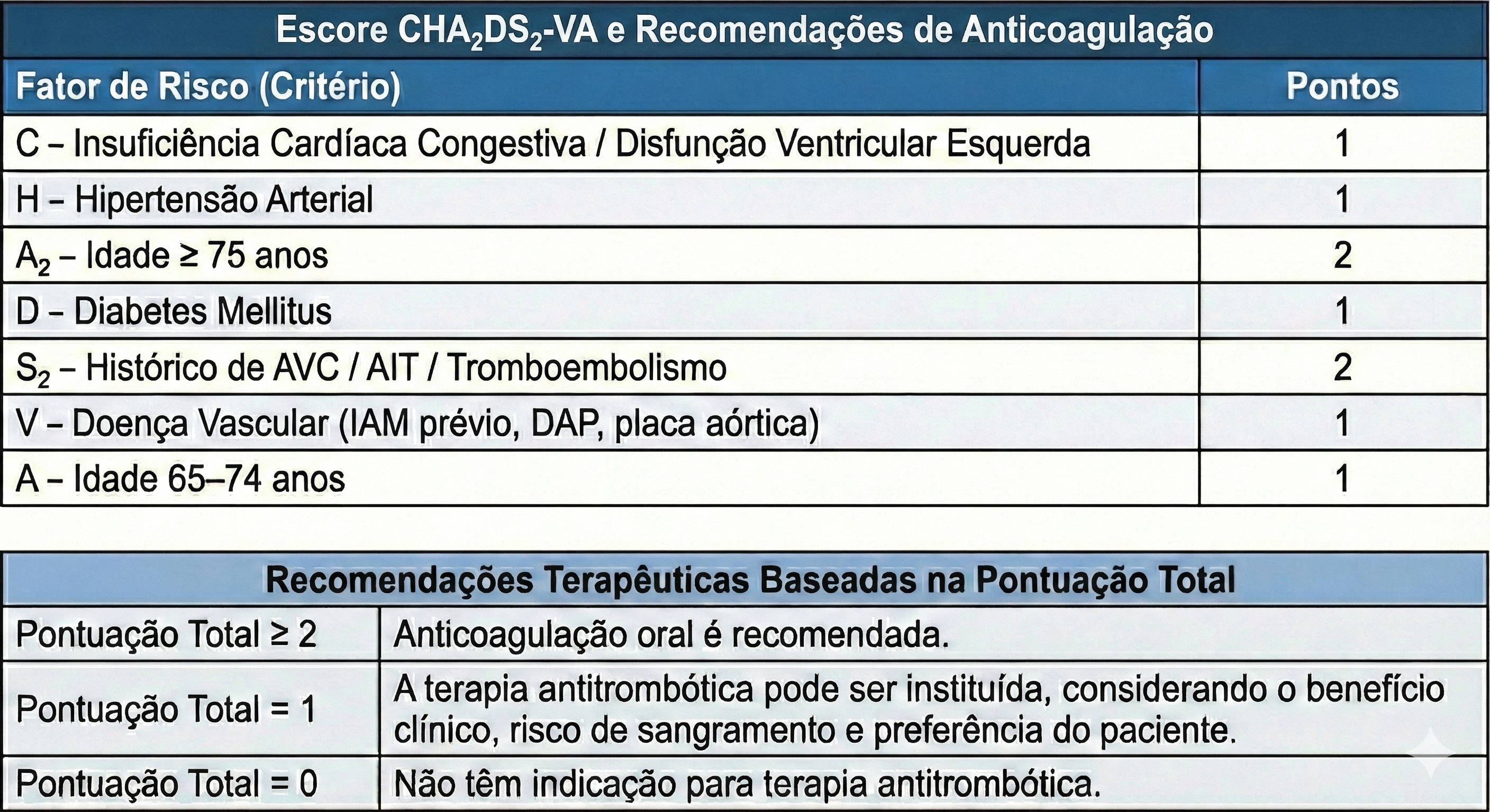 Esta calculadora é uma ferramenta auxiliar. A decisão de anticoagulação deve considerar também o risco hemorrágico (ex: HAS-BLED) e preferências do paciente.