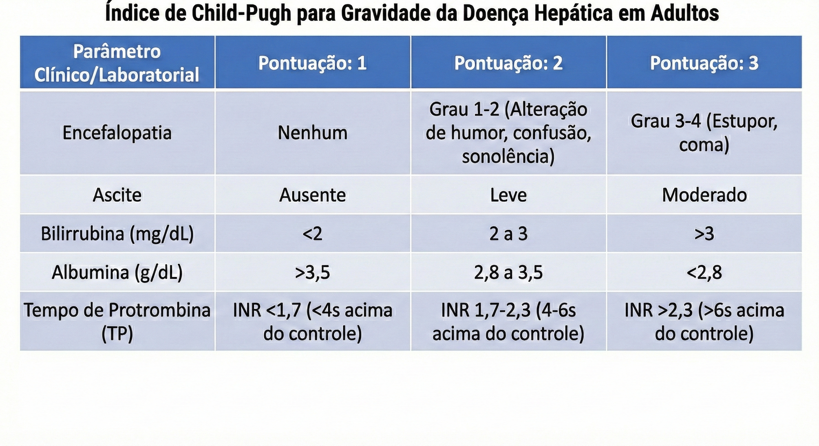3 Laboratoriais: Bilirrubina total, albumina sérica e o tempo de protrombina (avaliado pelo INR ou segundos acima do controle).
