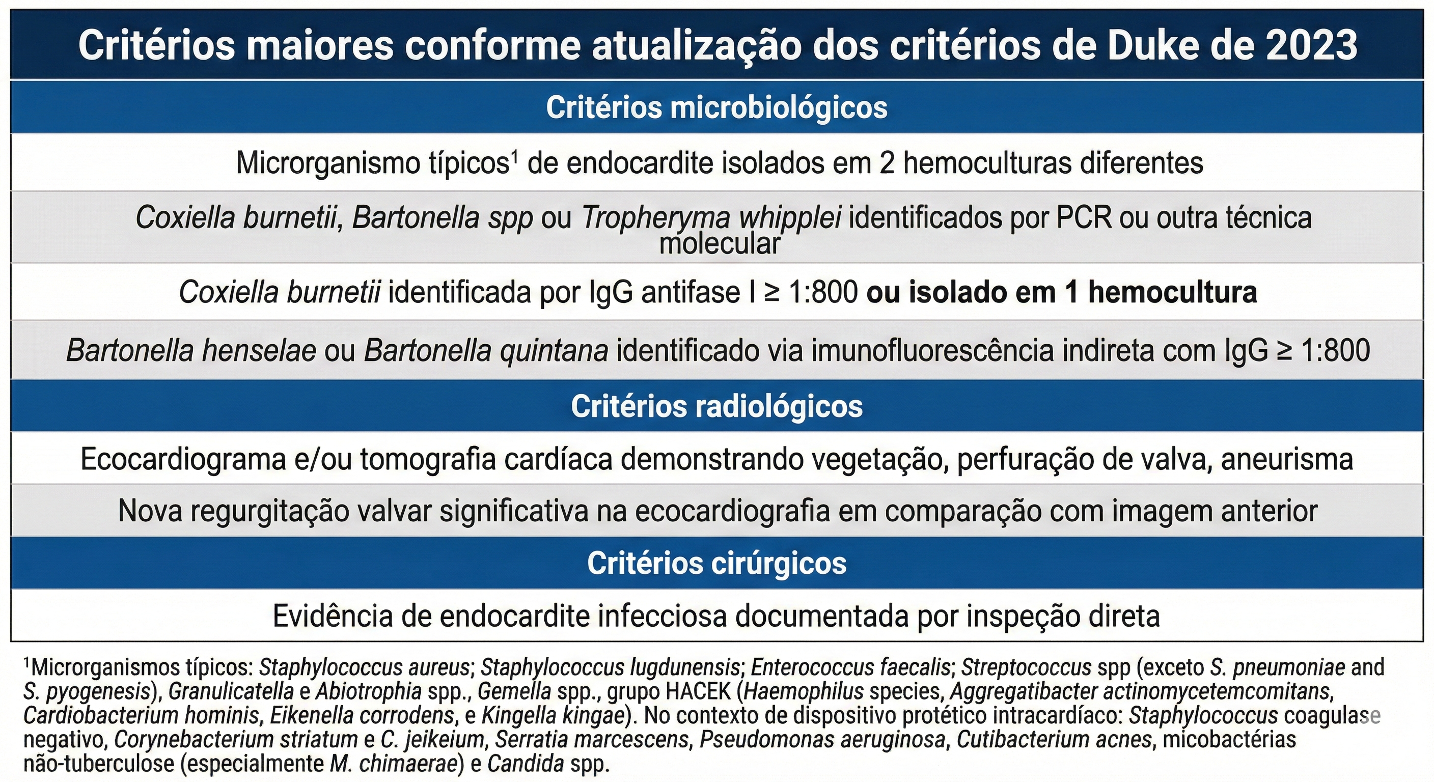 -Critérios Maiores: Evidências diretas de envolvimento endocárdico ou infecção sistêmica contínua (ex: hemoculturas positivas persistentes e vegetações valvares ao ecocardiograma).