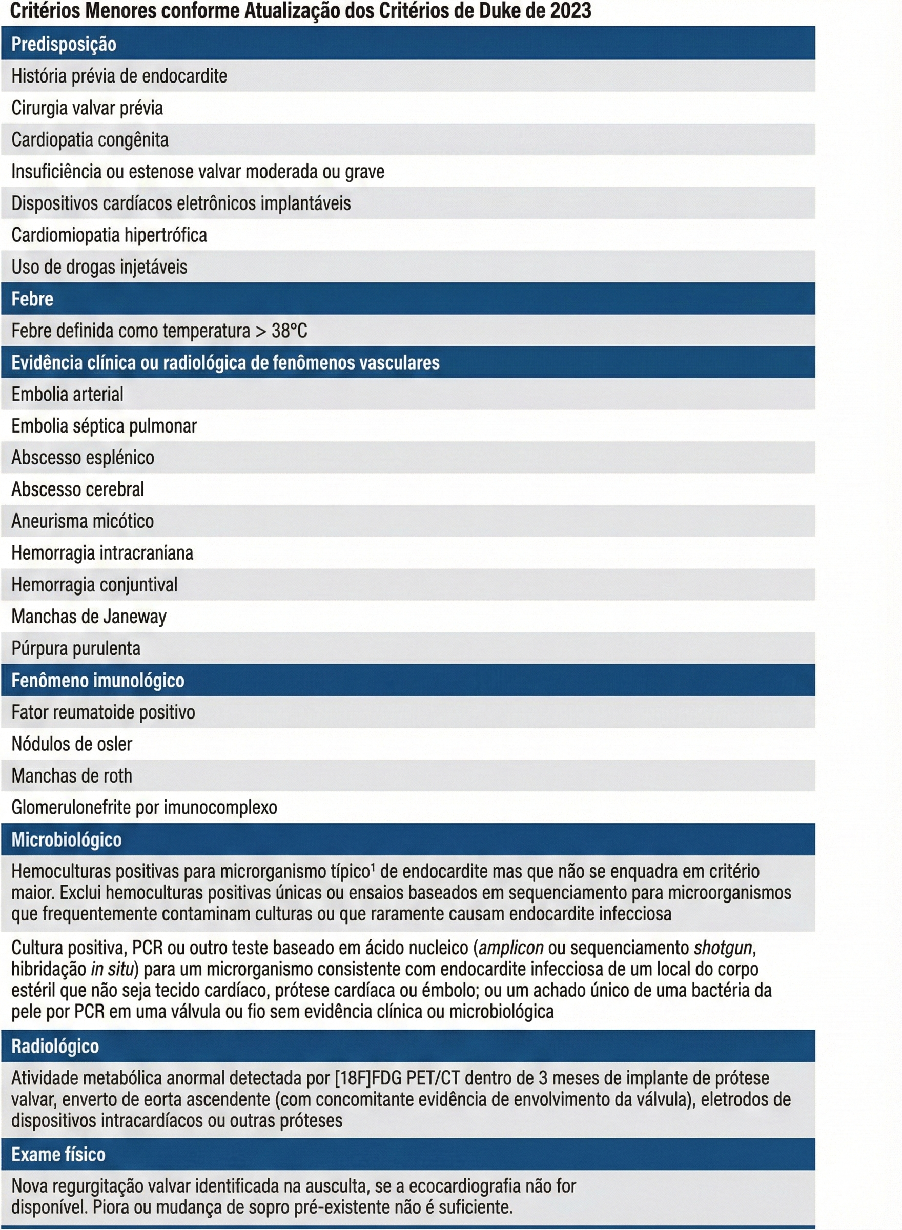 -Critérios Menores: Sinais indiretos ou fatores de risco (ex: febre, fenômenos vasculares, fenômenos imunológicos e condições cardíacas predisponentes).