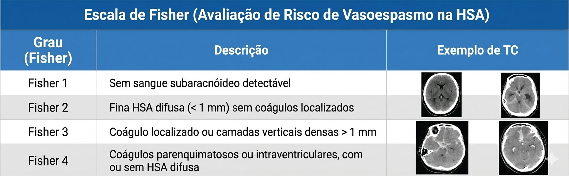 A Escala de Fisher é uma ferramenta de apoio fundamental no manejo de pacientes com hemorragia subaracnóidea (HSA) de origem aneurismática. Sua principal função é predizer o risco de desenvolvimento de vasoespasmo cerebral subsequente (o estreitamento do calibre dos vasos sanguíneos, que pode levar a isquemia tardia), e não necessariamente o desfecho clínico global do paciente.