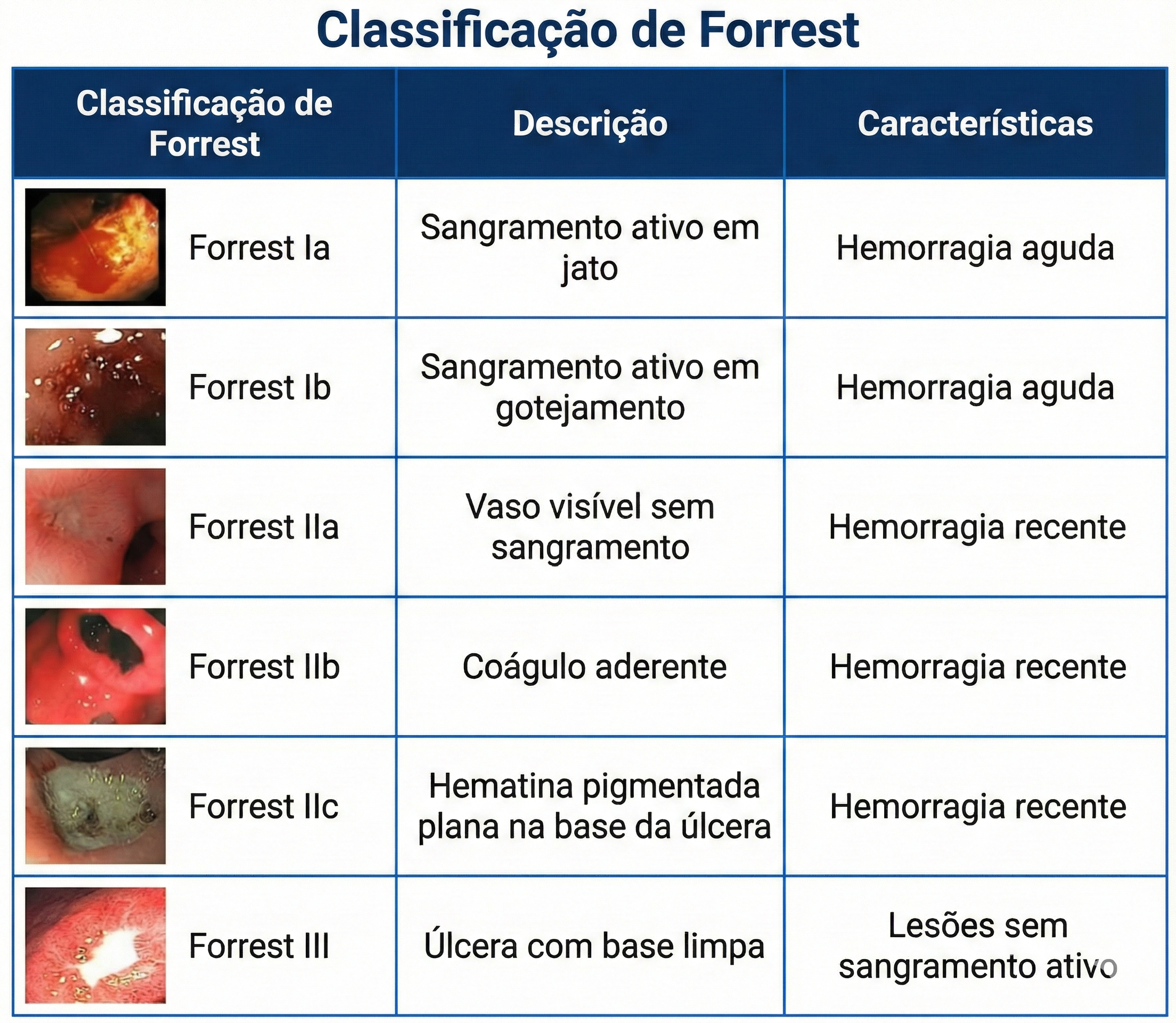 A Classificação de Forrest é um sistema de graduação endoscópica essencial na abordagem da hemorragia digestiva alta por úlcera péptica. Seu conceito baseia-se na categorização das úlceras em três grupos principais, dependendo de sua aparência macroscópica durante o exame: sangramento ativo, sinais (estigmas) de sangramento recente ou úlceras sem sinais de sangramento.