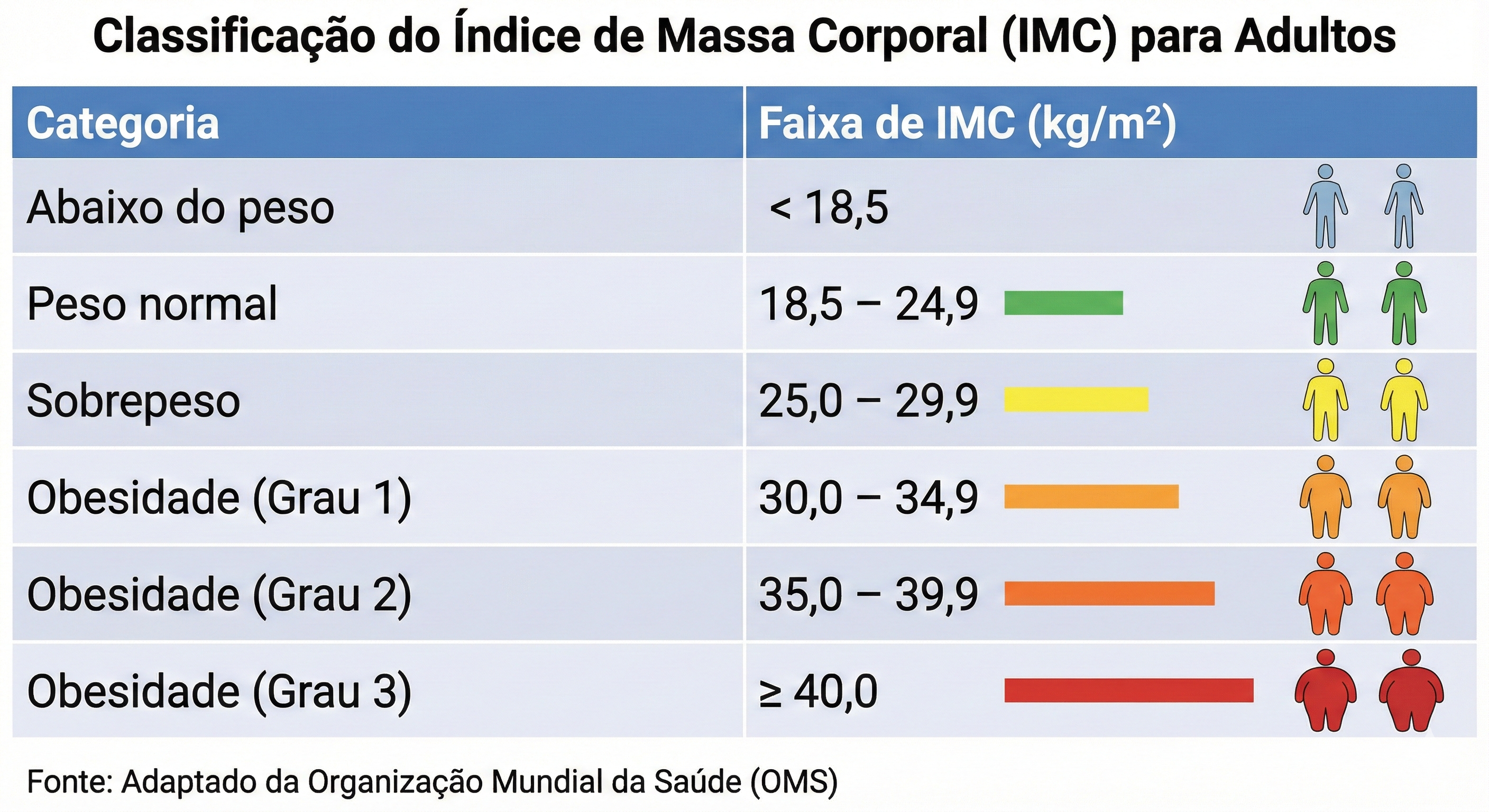 A classificação pelo IMC é fundamental porque o excesso de peso corporal está fortemente correlacionado a graves problemas de saúde. Um IMC elevado é um fator de risco bem estabelecido para diversas doenças crônicas e causas de mortalidade, incluindo: