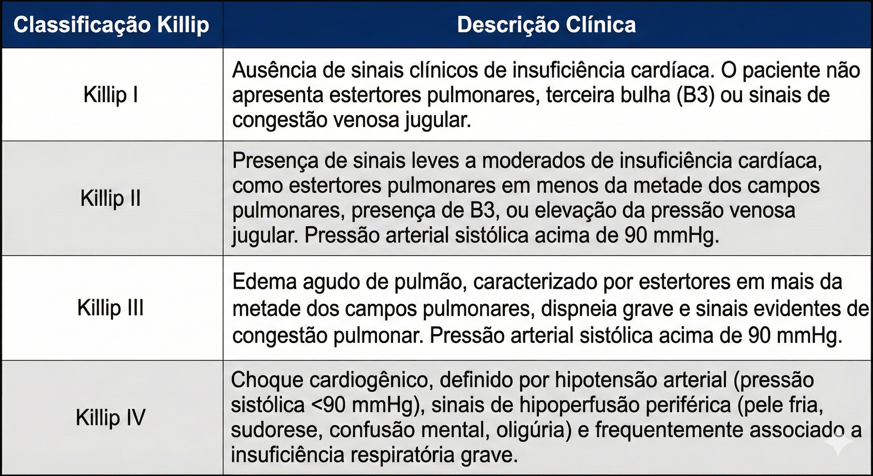 A Classificação de Killip é um sistema de estratificação de risco prognóstico desenvolvido especificamente para o contexto do infarto agudo do miocárdio (IAM). A ferramenta avalia a gravidade da disfunção ventricular esquerda aguda baseando-se exclusivamente em achados do exame físico cardiovascular e pulmonar no momento da admissão. Existe uma correlação direta e bem estabelecida entre a classe Killip atribuída e o risco de mortalidade intra-hospitalar.