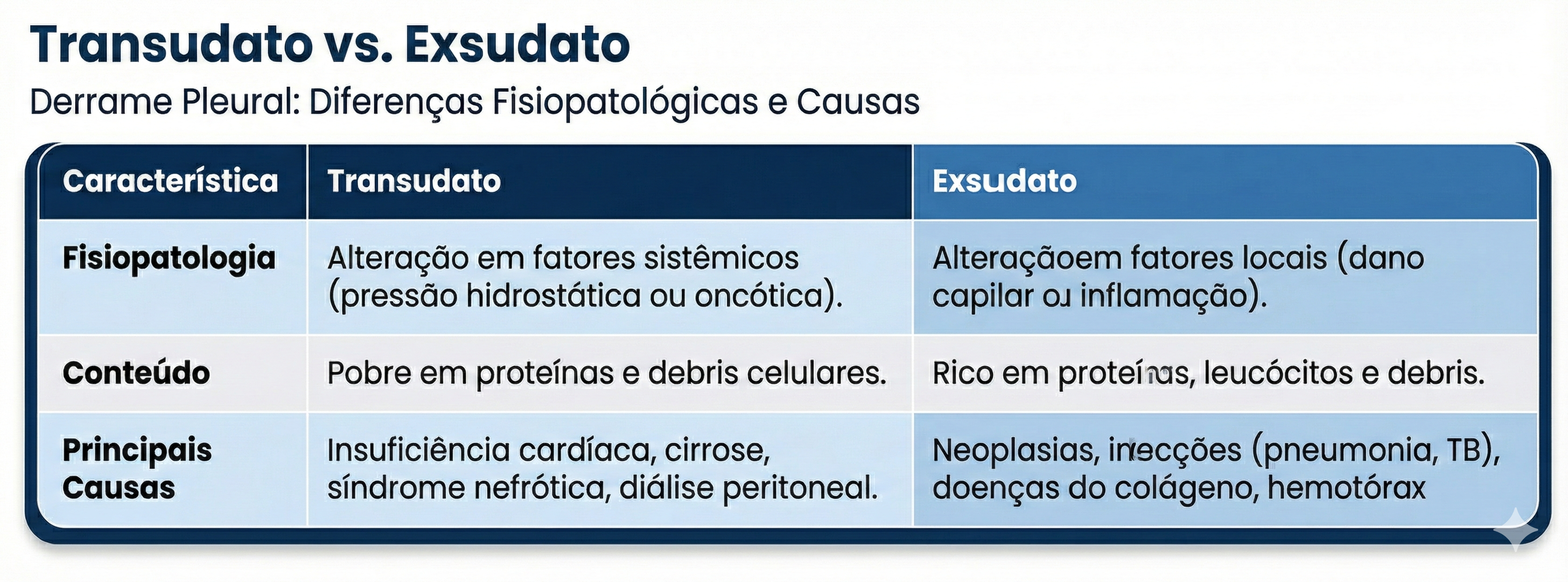 A distinção entre transudato e exsudato é o passo fundamental após o diagnóstico de um derrame pleural. Essa classificação orienta a investigação etiológica e a conduta terapêutica.