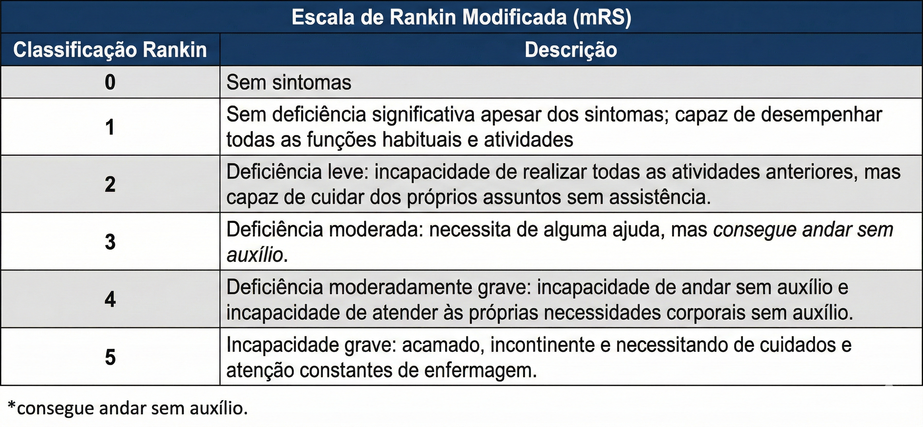 A Escala de Rankin Modificada (mRS) tem como objetivo avaliar o nível global de incapacidade e o grau de dependência funcional do paciente após um Acidente Vascular Cerebral (AVC). A ferramenta categoriza a independência funcional com base na comparação com as atividades realizadas no período pré-AVC, em vez de focar no desempenho em tarefas específicas isoladas. A avaliação abrange aspectos físicos e não físicos essenciais para a automanutenção do indivíduo.