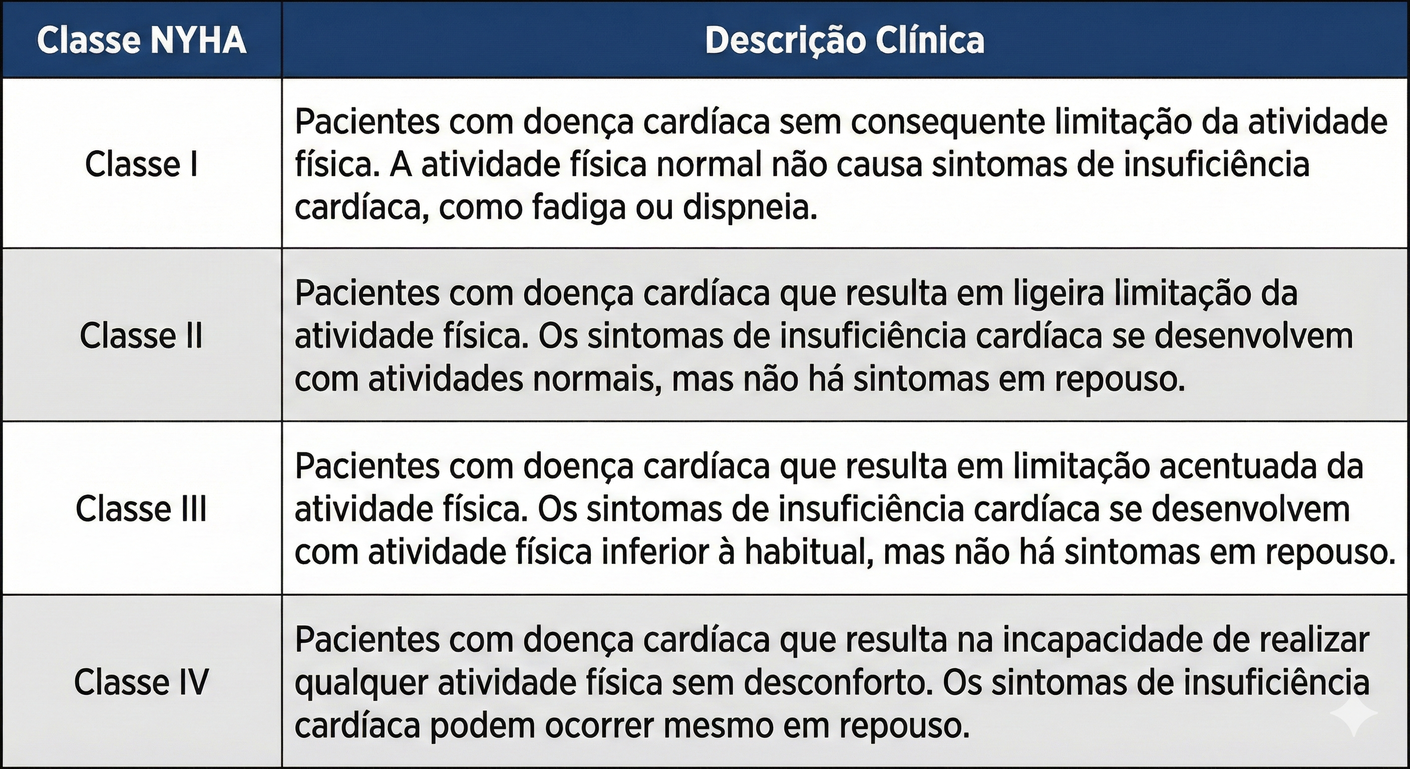 A Classificação Funcional da New York Heart Association (NYHA) é o sistema mais amplamente utilizado na prática clínica para avaliar a gravidade da insuficiência cardíaca (IC). Seu objetivo principal é quantificar o impacto dos sintomas (como dispneia e fadiga) na capacidade funcional do paciente, estratificando o grau de limitação imposto pela doença durante as atividades cotidianas. O sistema divide os pacientes em quatro classes, baseando-se no nível de esforço físico necessário para desencadear a sintomatologia.