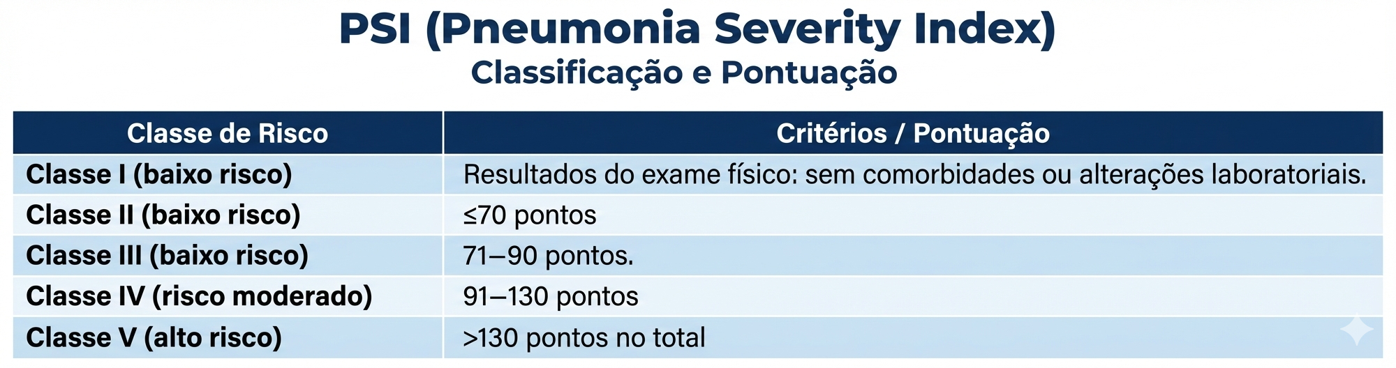 O Pneumonia Severity Index (PSI) é o escore preferencial para a avaliação prognóstica de pacientes com pneumonia adquirida na comunidade. A sua superioridade clínica deve-se à elevada acurácia na previsão da mortalidade e, fundamentalmente, à sua capacidade de identificar com segurança os pacientes de baixo risco.