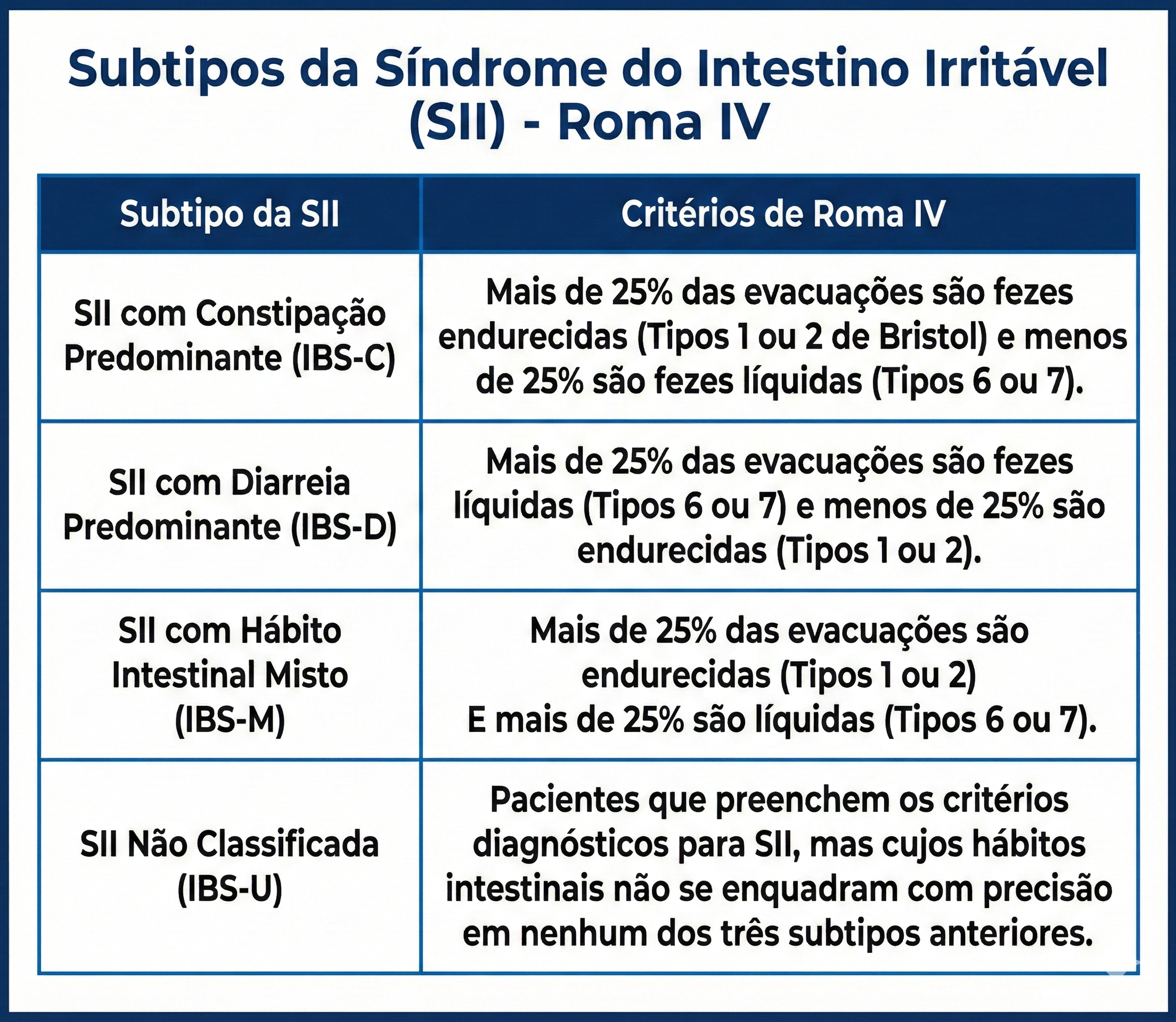 A SII é classificada em quatro subtipos principais, baseados na predominância da consistência das fezes (Escala de Bristol) apenas nos dias em que o hábito intestinal está alterado (anormal).